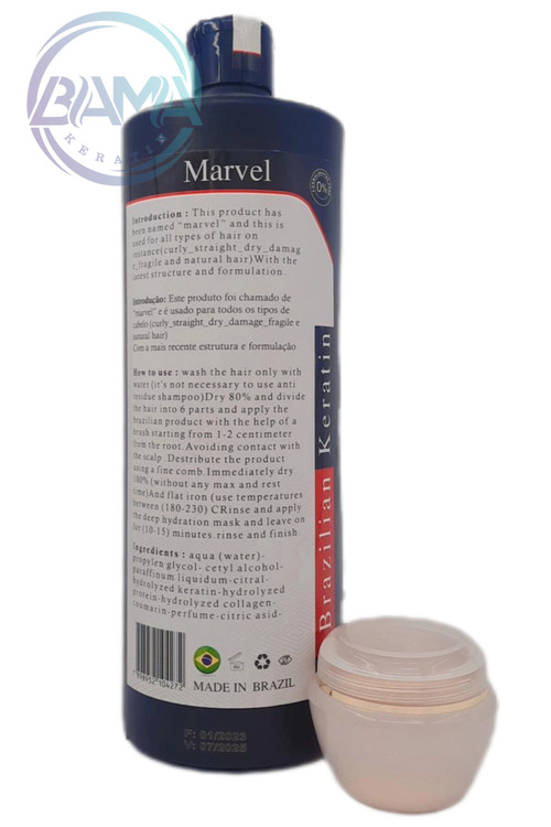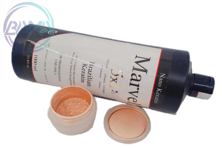 همراه با کراتین مارول 5 در 1 ، یک ظرف شیشه ای کوچک قرار دارد که حاوی یک پودر طلایی رنگ است. این پودر برای موهایی با آسیب بسیار بالا استفاده می شود. کراتین مارول دارای احیا و صافی صددرصد است و حالت ابریشمی و شاین بالایی بر روی موها ایجاد می کند.